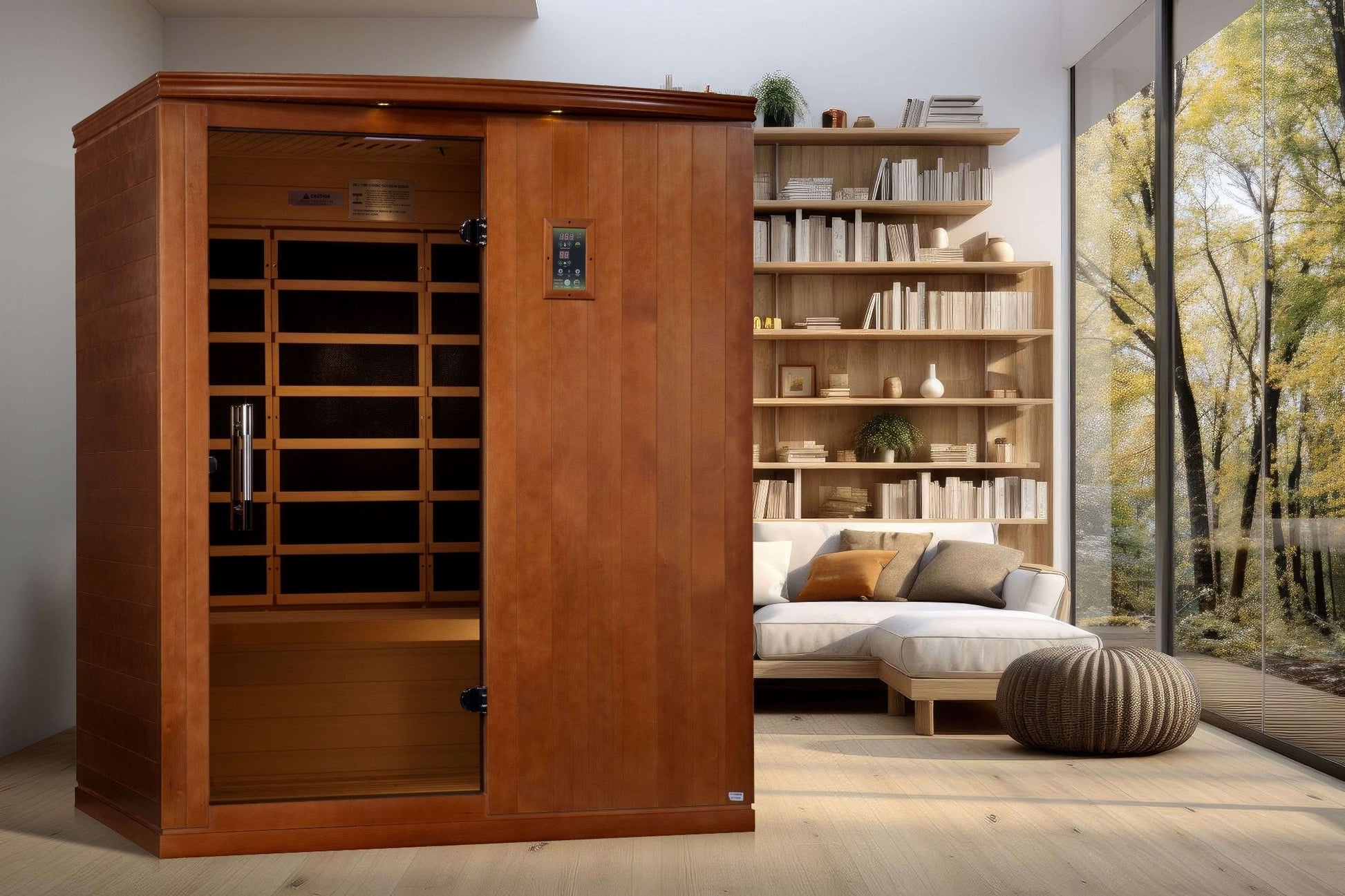 The Dynamic Madrid Elite 3-Person Ultra Low EMF Infrared Sauna combines spacious comfort, refined design, and advanced PureTech™ infrared heating technology to deliver a complete at-home wellness experience. Built from environmentally friendly Canadian Hemlock with a warm Honey Dark Stain finish, the Madrid Elite offers a premium spa ambiance that enhances any indoor space.